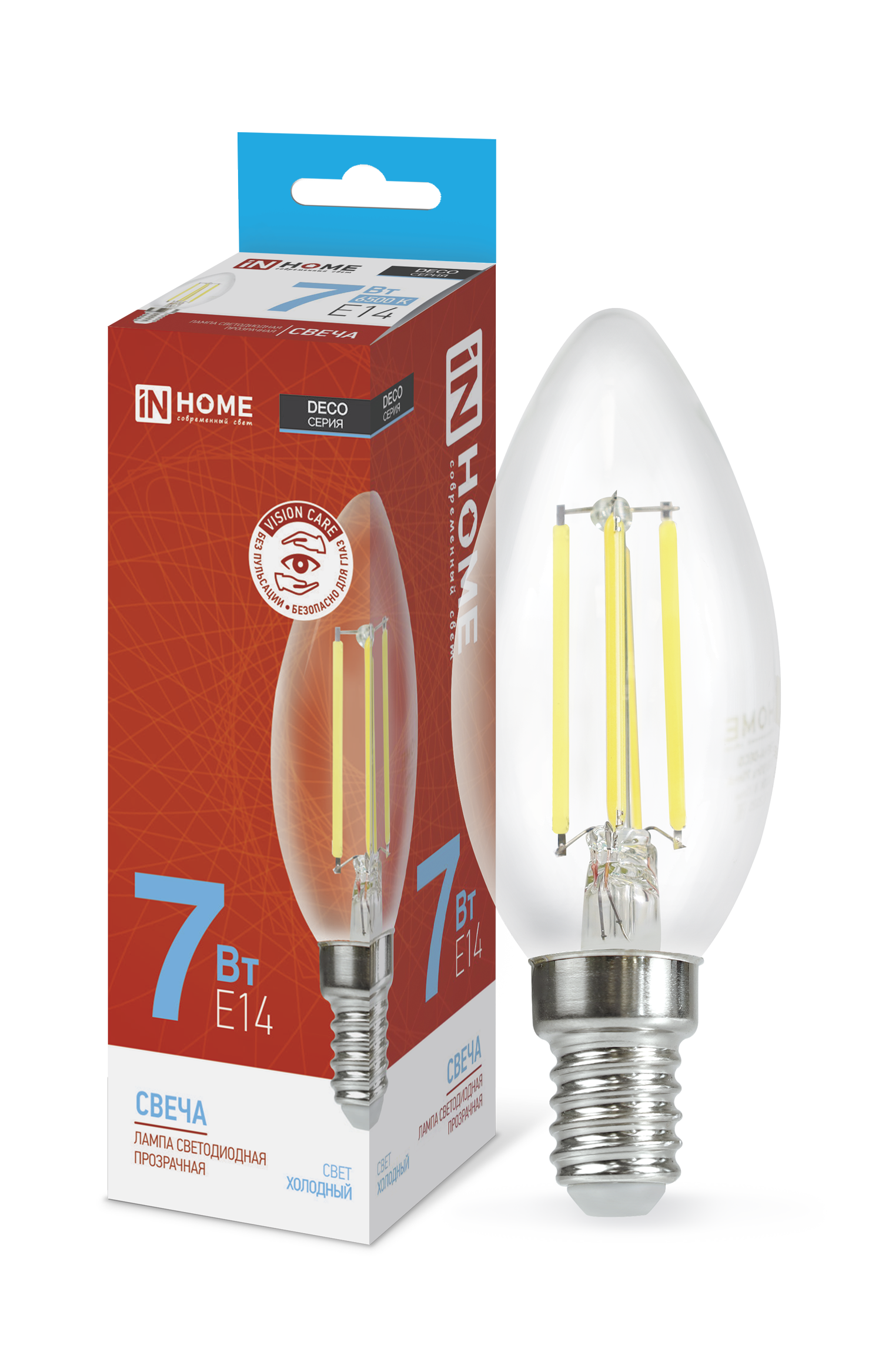 Лампа светодиодная LED-СВЕЧА-deco 7Вт 230В Е14 6500К 810Лм прозрачная IN HOME