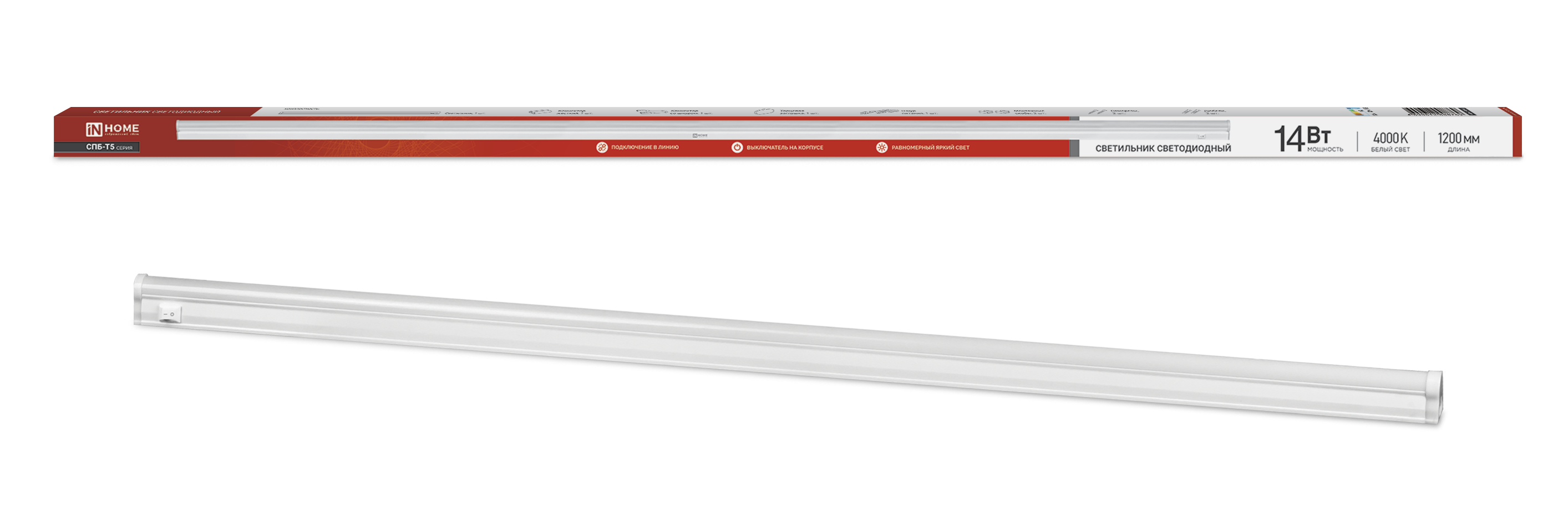 Светильник светодиодный СПБ-Т5 14Вт IN HOME — линейный LED-светильник для локального и акцентного освещения. Обеспечивает равномерный световой поток и энергоэффективную работу, являясь современной альтернативой люминесцентным светильникам Т5.