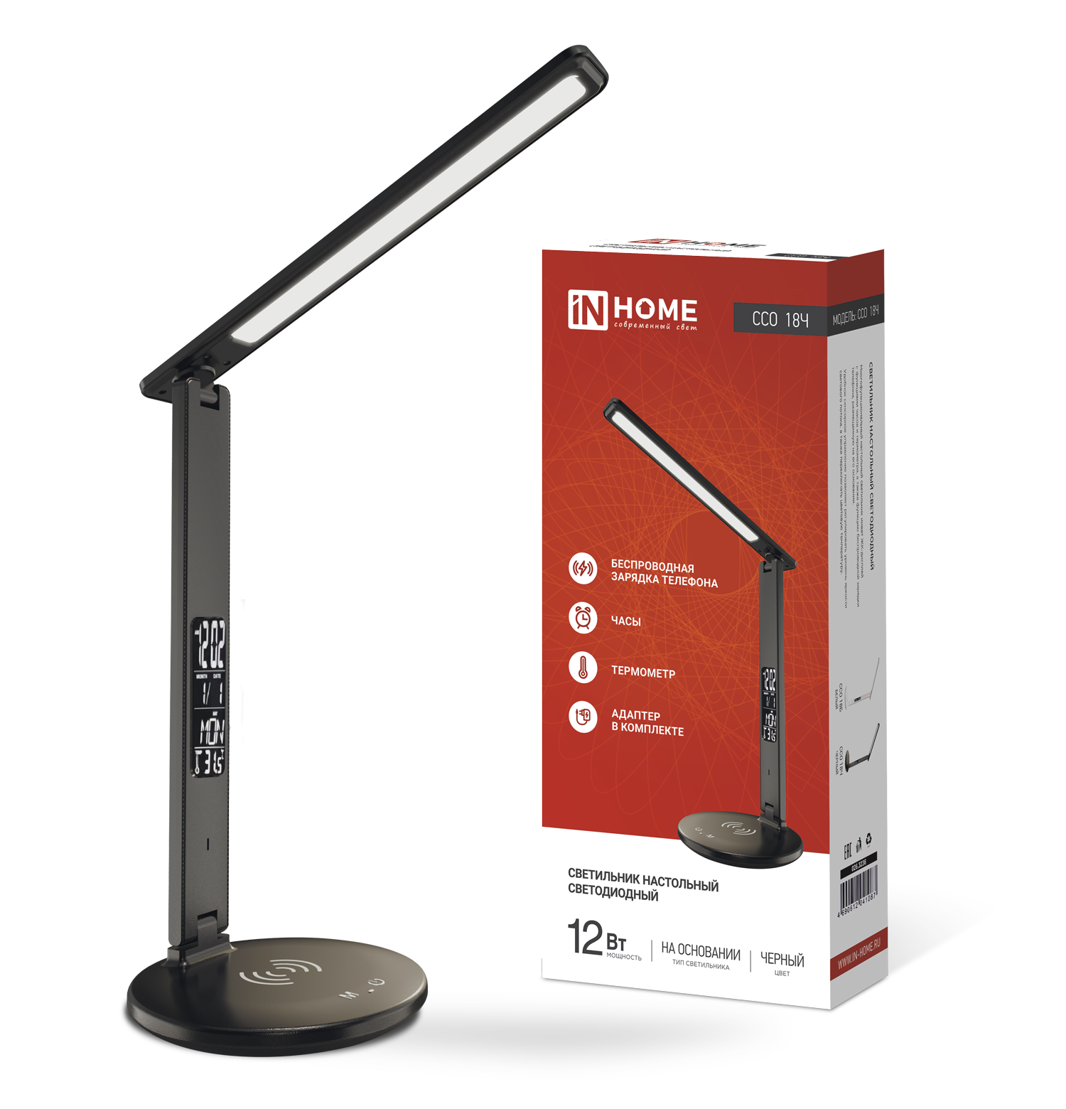 Светильник настольный светодиодный PLUS ССО-18Ч 12Вт 3000-6500К 600Лм сенсор, с беспроводной зарядкой, часы, температура, с адаптером ЧЕРНЫЙ IN HOME