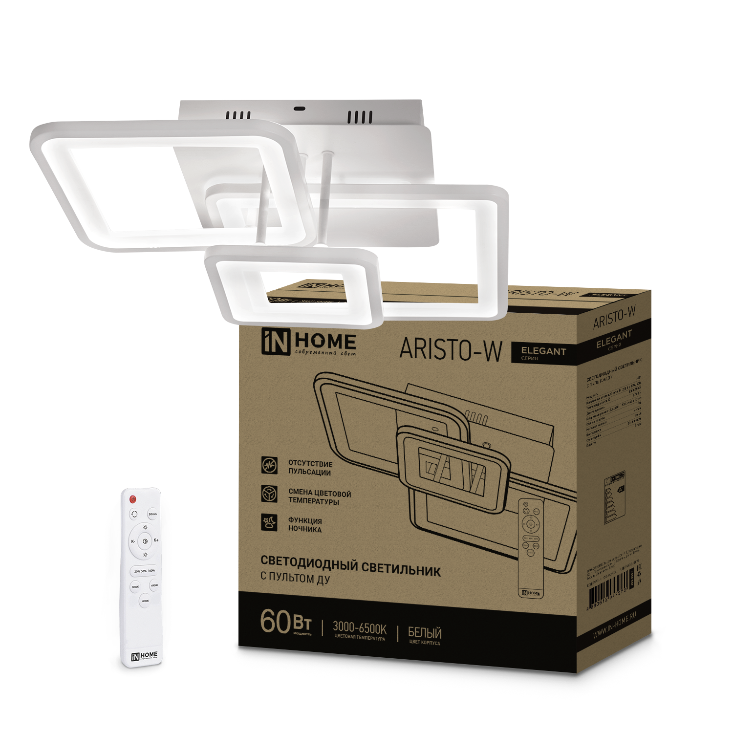 Светильник светодиодный ELEGANT ARISTO-W 60Вт 230В 3000-6500K 4700Лм 530х448х150мм пульт ДУ белый IN HOME