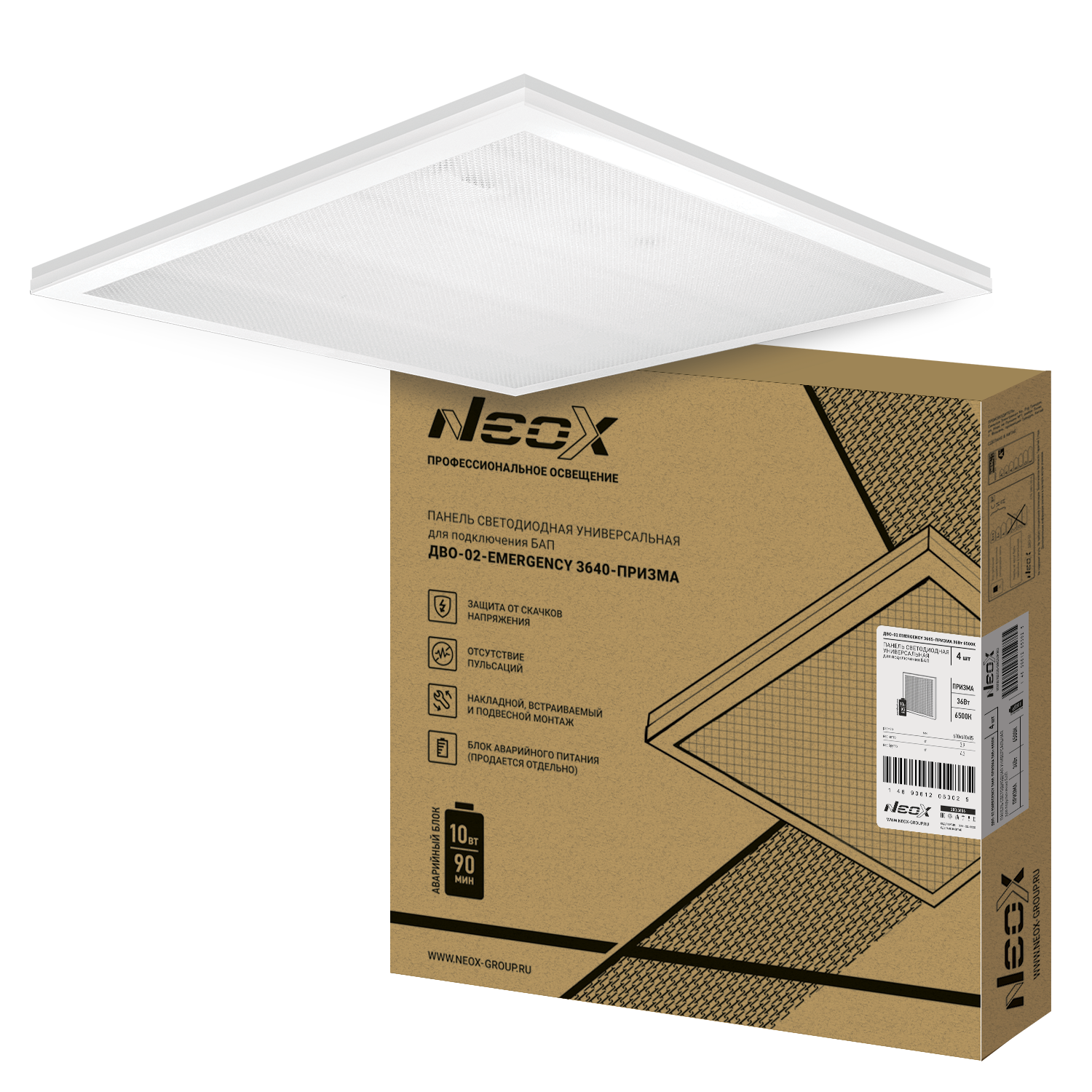 Панель светодиодная универсальная ДВО-02-EMERGENCY 3640-ПРИЗМА 36Вт 4000К без БАП-10W90 IP40 595х595x15мм NEOX