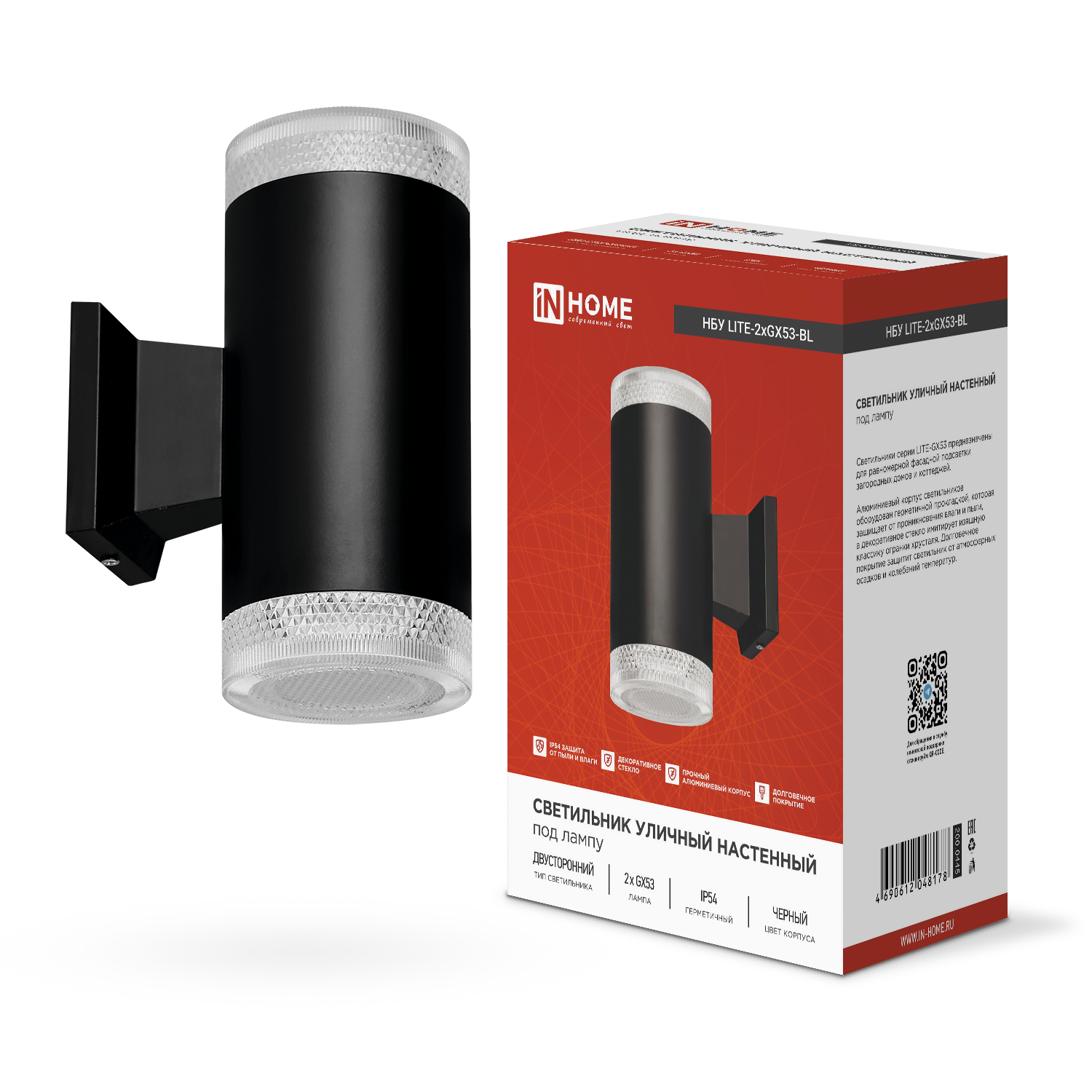Светильник уличный настенный двусторонний НБУ LITE-2xGX53-BL IN HOME — современное решение для фасадного и декоративного освещения жилых и коммерческих объектов. Подходит для подсветки загородных домов, коттеджей, входных групп и архитектурных элементов.