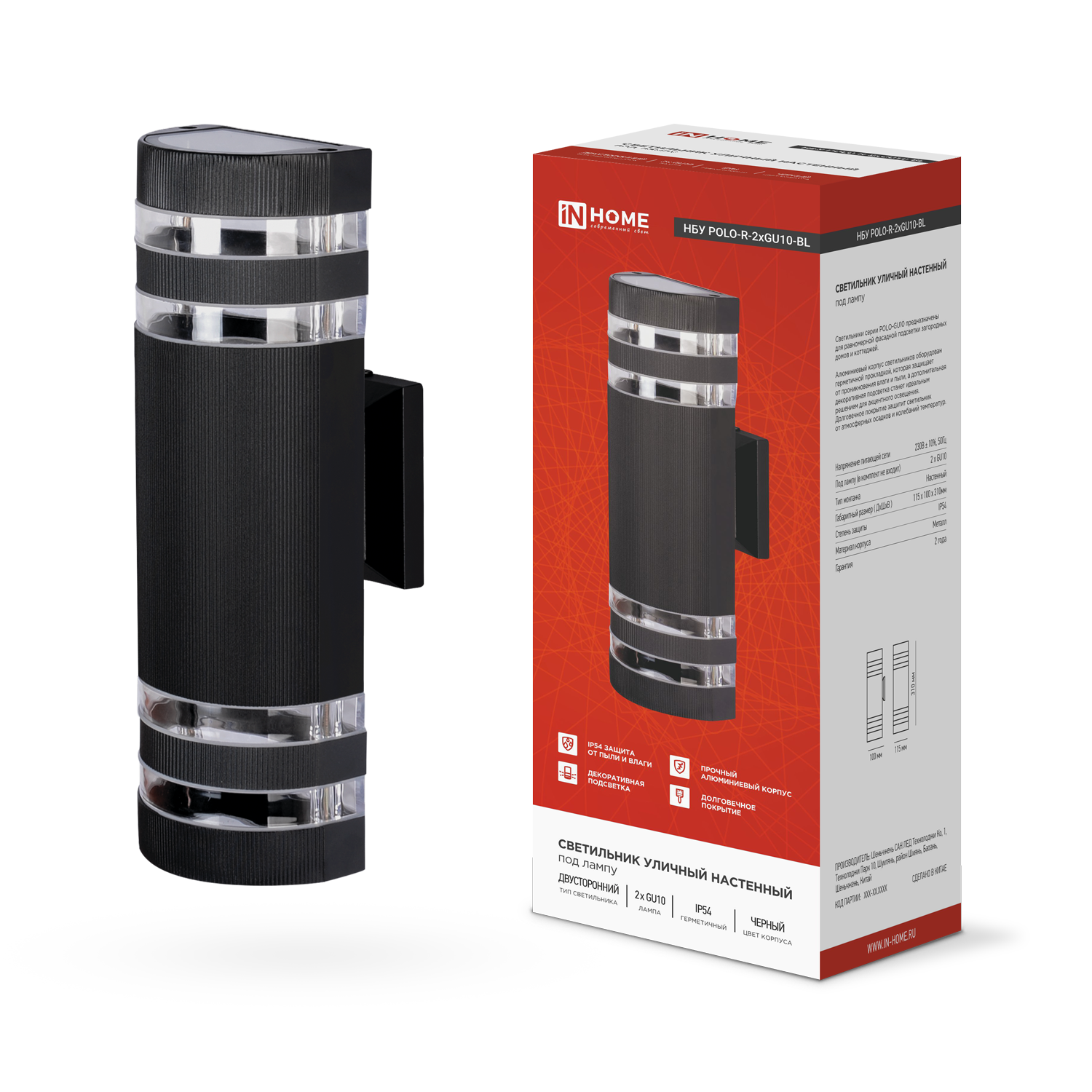 Светильник уличный настенный двусторонний НБУ POLO-R-2xGU10-BL IN HOME предназначен для фасадной подсветки загородных домов, коттеджей и коммерческих зданий. Двусторонняя конструкция обеспечивает направленное освещение вверх и вниз, создавая выразительный архитектурный эффект.