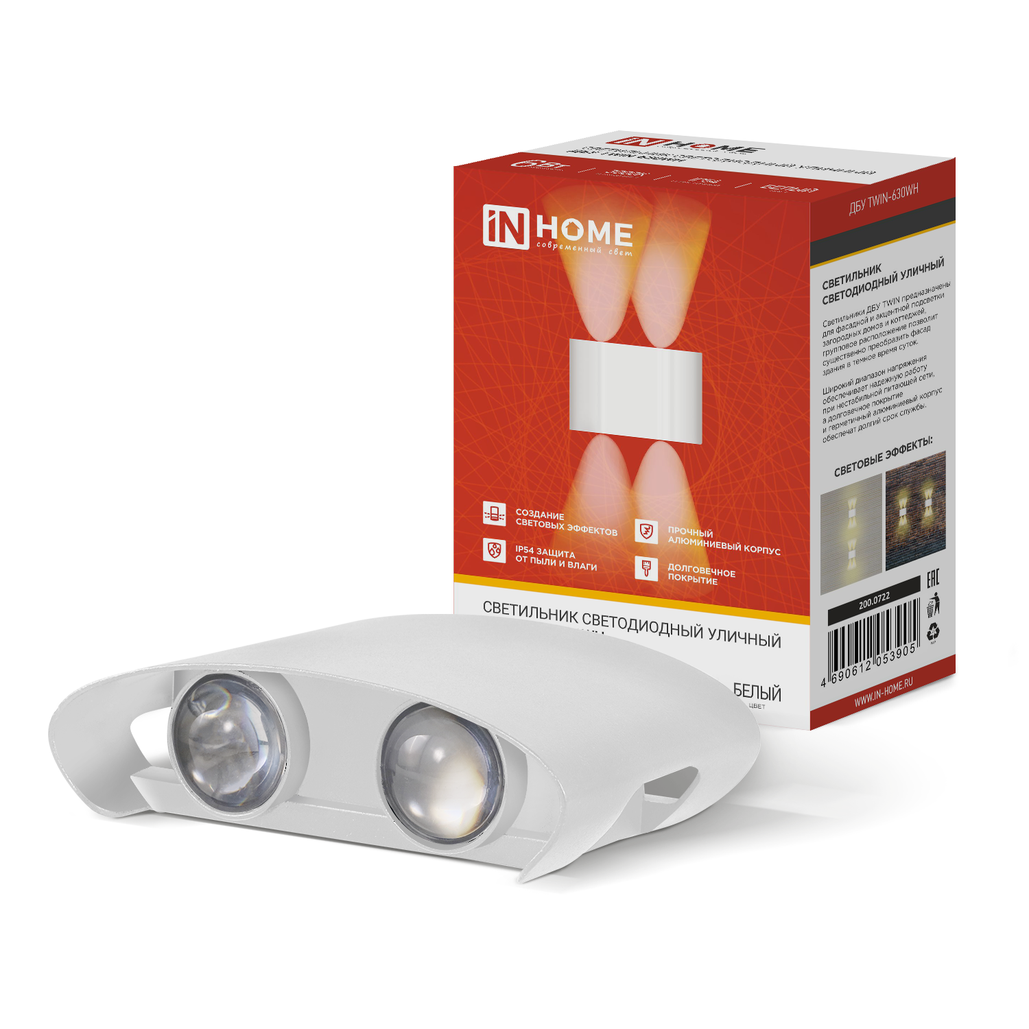 Светильник уличный светодиодный ДБУ TWIN-630WH 6Вт IN HOME — компактное и энергоэффективное решение для фасадного и декоративного освещения. Подходит для подсветки загородных домов, коттеджей, входных групп и архитектурных элементов.