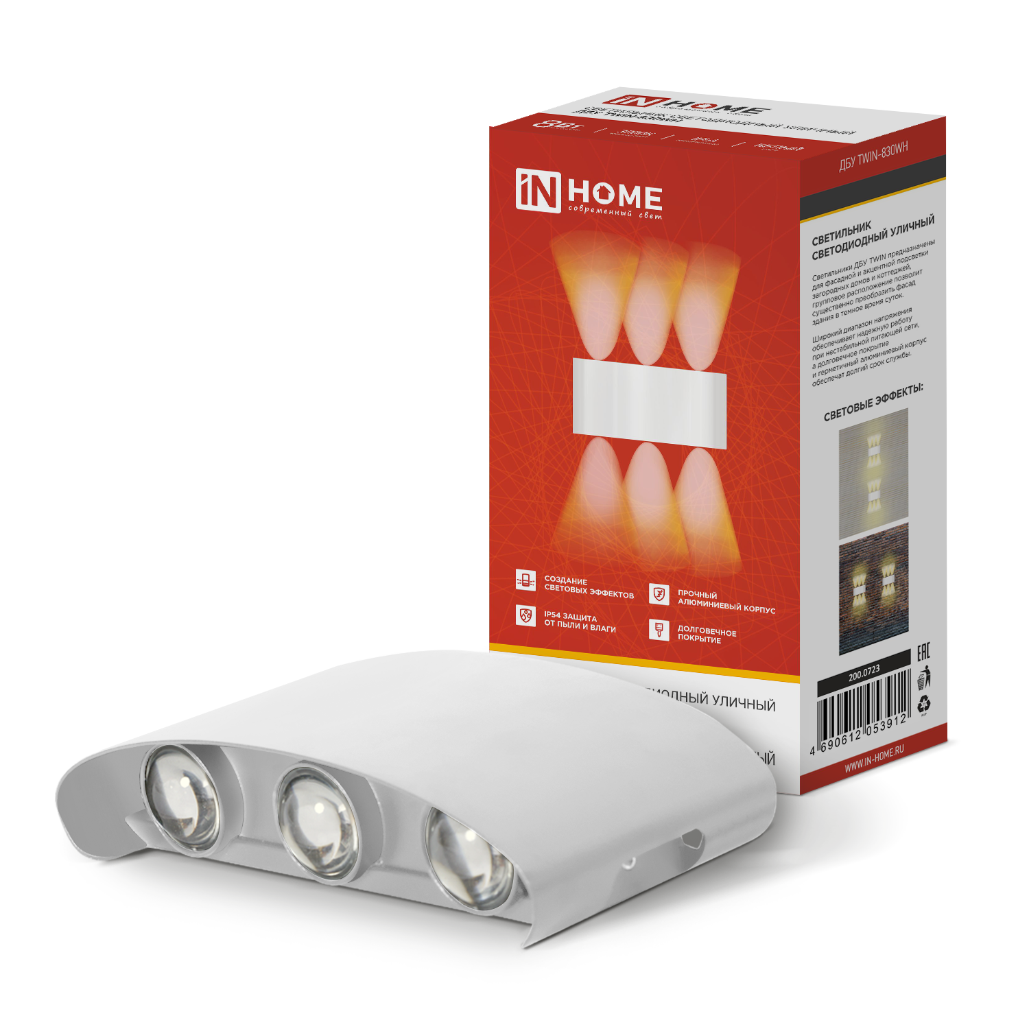 Светильник уличный светодиодный ДБУ TWIN-830WH IN HOME предназначен для фасадной и акцентной подсветки загородных домов, коттеджей и архитектурных элементов.